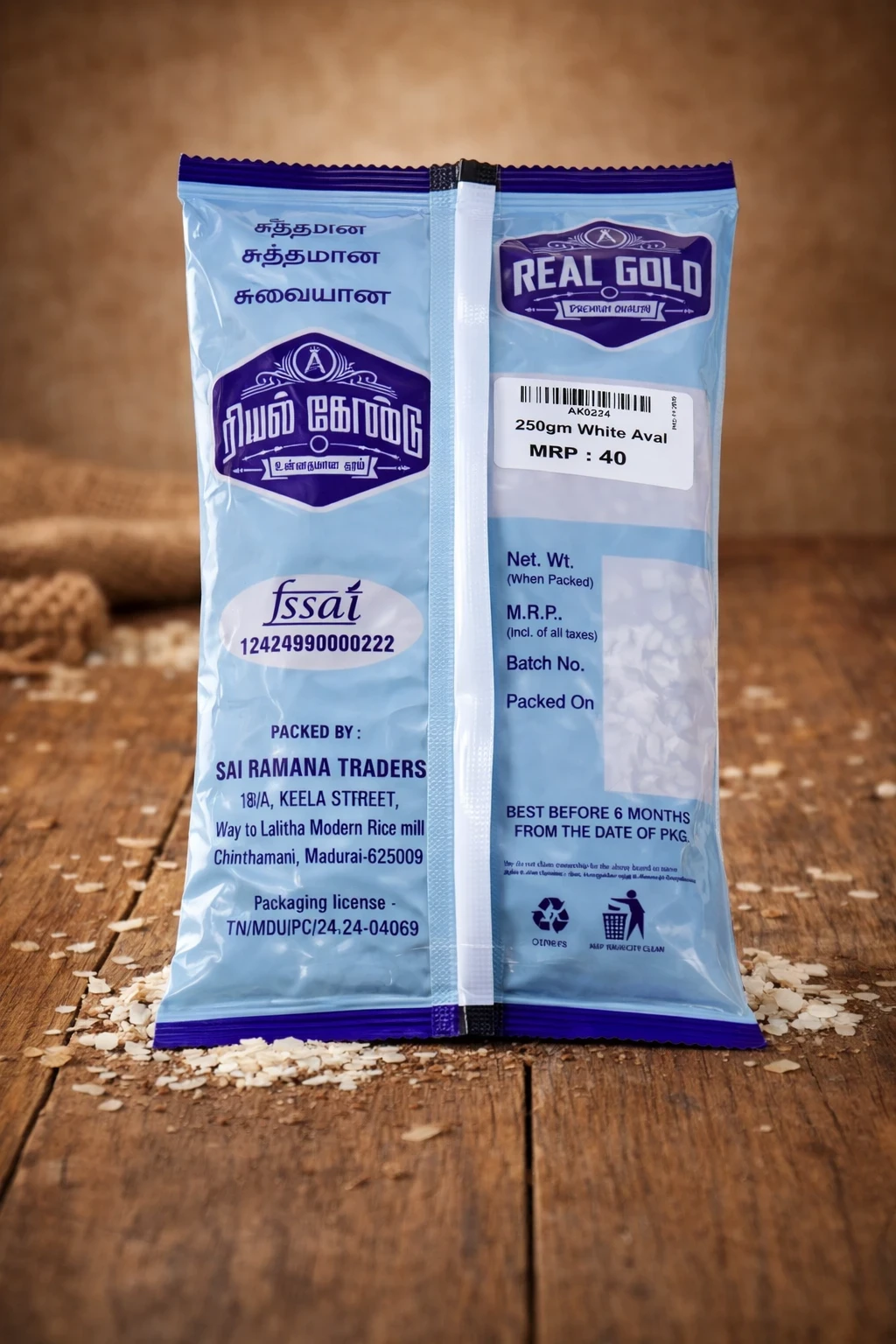 White Aval (Flattened Rice) is a light, nutritious, and versatile staple made from premium quality rice that is carefully flattened to preserve its natural taste and texture. Soft, easy to cook, and quick to prepare, it is perfect for traditional South Indian dishes like poha, aval upma, sweet aval, and snacks. This 250gm pack is hygienically processed and packed to retain freshness, purity, and authentic flavor.