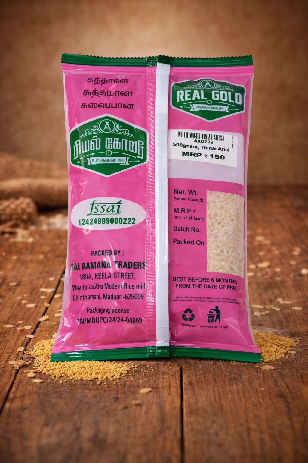 Thinai Arisi (Foxtail Millet) is a traditional and nutritious ancient grain widely used in Indian households. Naturally rich in fiber, protein, and essential minerals, it is a healthy alternative to regular rice. This 500gm pack of Thinai Arisi is carefully cleaned and packed to retain its natural taste and quality. It is easy to cook and perfect for preparing pongal, upma, dosa, or even millet rice.